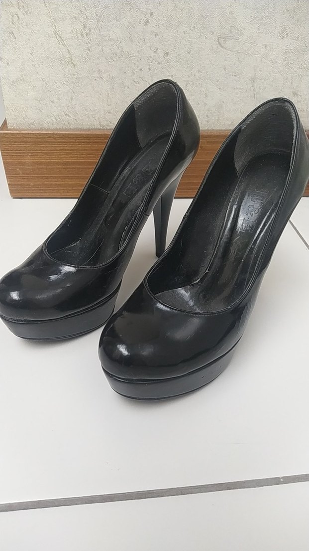 Ofis kullanımı için uygun, siyah rugan parlak platform topuklu ayakkabılar. Klasik gotik tarzda,