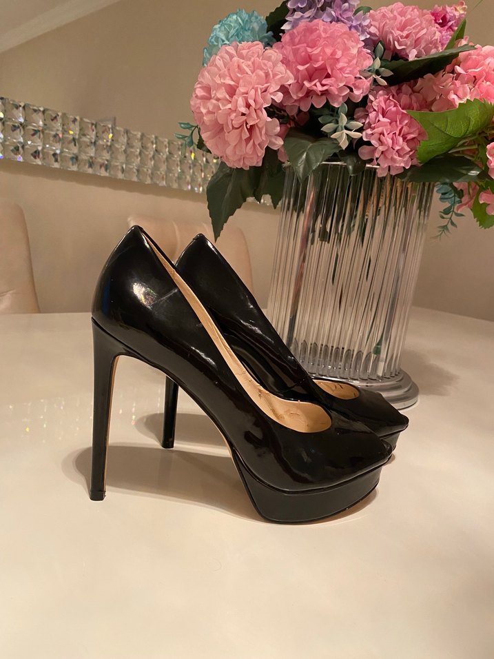 Siyah rugan platform topuklu stiletto, parlak ve desenli olmayan modern tasarım. Romantik akşamlar için ideal.