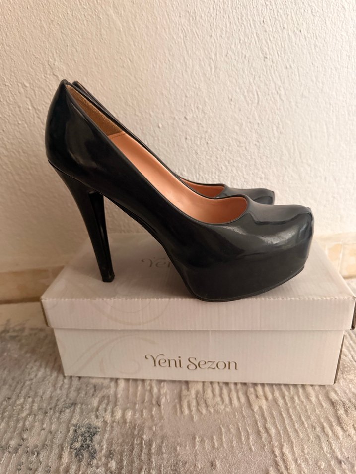 Parlak siyah rugan platform topuklu stiletto, modern klasik tarzda, romantik akşamlar için uygun. Kauçuk malzemeden, cesur ve koyu renkli desenli. "Yeni Sezon" etiketiyle.