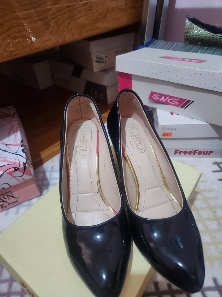 Rugan görünümlü siyah kadın stiletto, baskılı desene sahip ve kauçuk malzemeden üretilmiştir. Cesur iş tarzı ve günlük kullanım için uygundur. Marka: FreeFour.