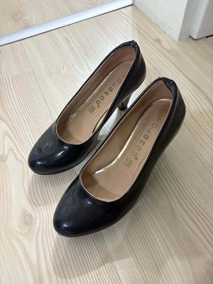 Siyah rugan, hafif yılan derisi desenli stiletto topuklu ayakkabılar. Modern klasik tarzda, ofis kullanımı için uygundur.