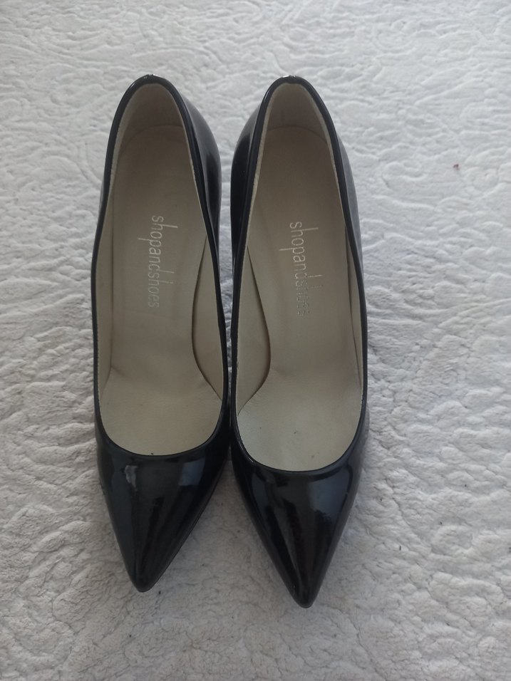 Parlak siyah rugan stiletto, sivri burun ve kauçuk malzemeden, klasik ve şık ofis kullanımı için uygundur.. Pazarlık payı vardır