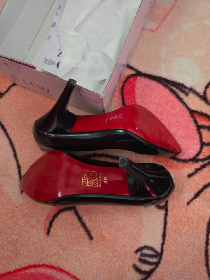 Klasik ve çağdaş tarzda, parlak siyah renkli, stiletto topuklu ayakkabı. Dışarıda hiç giyilmemiştir evde denenmiştir sadece
