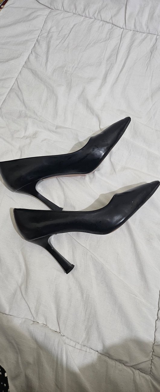 Kauçuk malzemeden yapılmış siyah stiletto topuklu ayakkabı, klasik ve gotik tarzda. Ofis için zahmetsiz şıklık sunar.