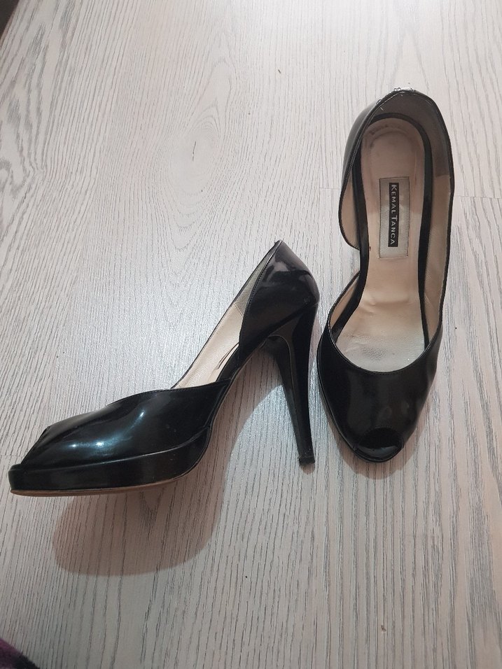 Siyah, rugan görünümlü, lastik malzemeden yapılmış, desensiz stiletto topuklu ayakkabılar, klasik şıklık ve ofis kullanımı için uygundur. Kemal Tanca.