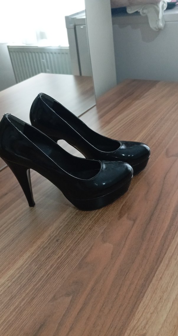 Siyah rugan görünümlü, lastik malzemeden yapılmış stiletto topuklu ayakkabılar. Klasik ve gotik tarzda, ofis kullanımı için uygun, desensiz ve koyu renkte.