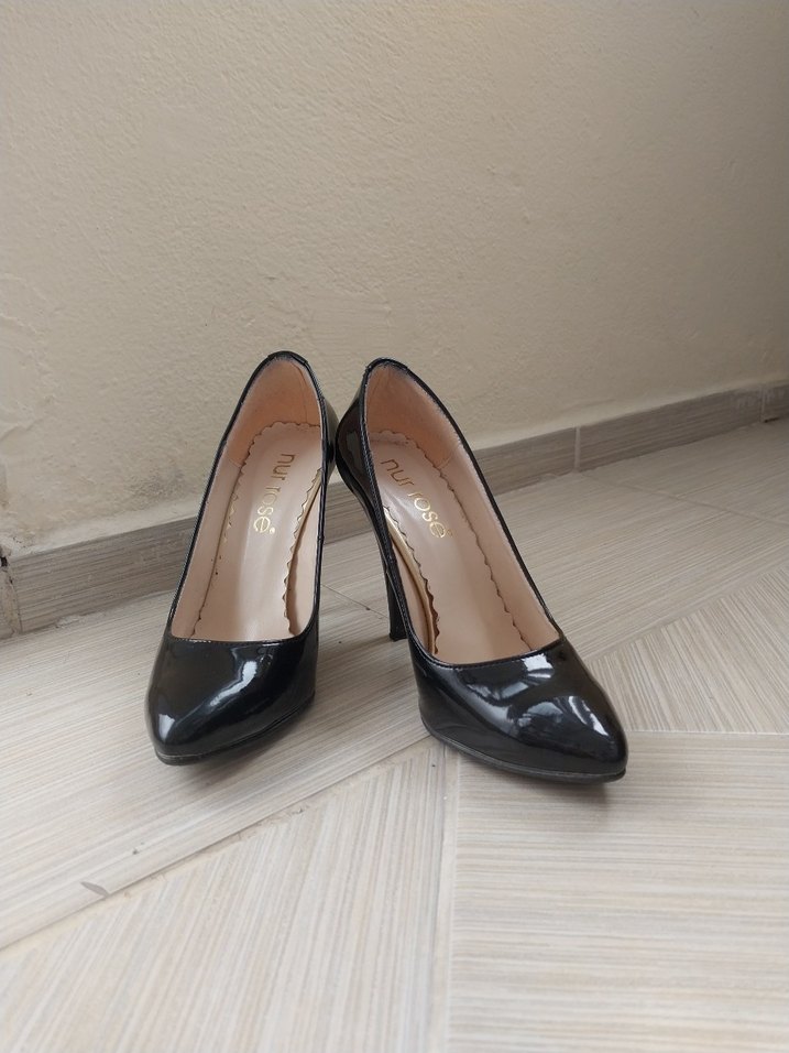 Siyah rugan görünümlü, modern klasik stilettolar. Ofis kullanımı için uygun, kauçuk malzemeden, desensiz tasarım.