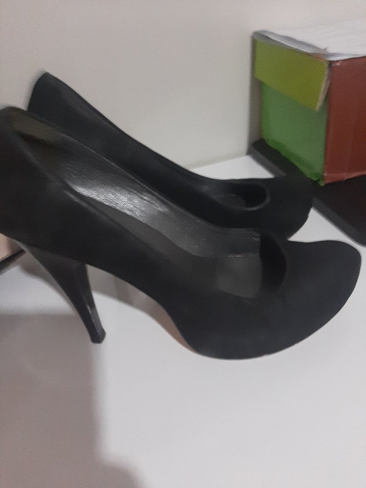 Siyah süettenyapılmış stiletto topuklu kadın ayakkabısı, romantik akşamlar için uygundur. Desensiz, koyu ve gotik tarzda, zahmetsiz şıklık sunar.