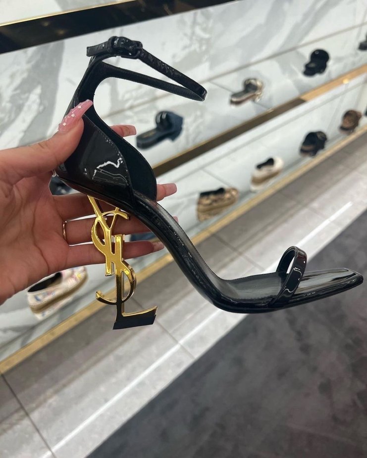 Siyah rugan stiletto topuklu, altın YSL logosu topuklu, tokalı bilek bantlı, çağdaş tasarımlı kadın ayakkabısı.