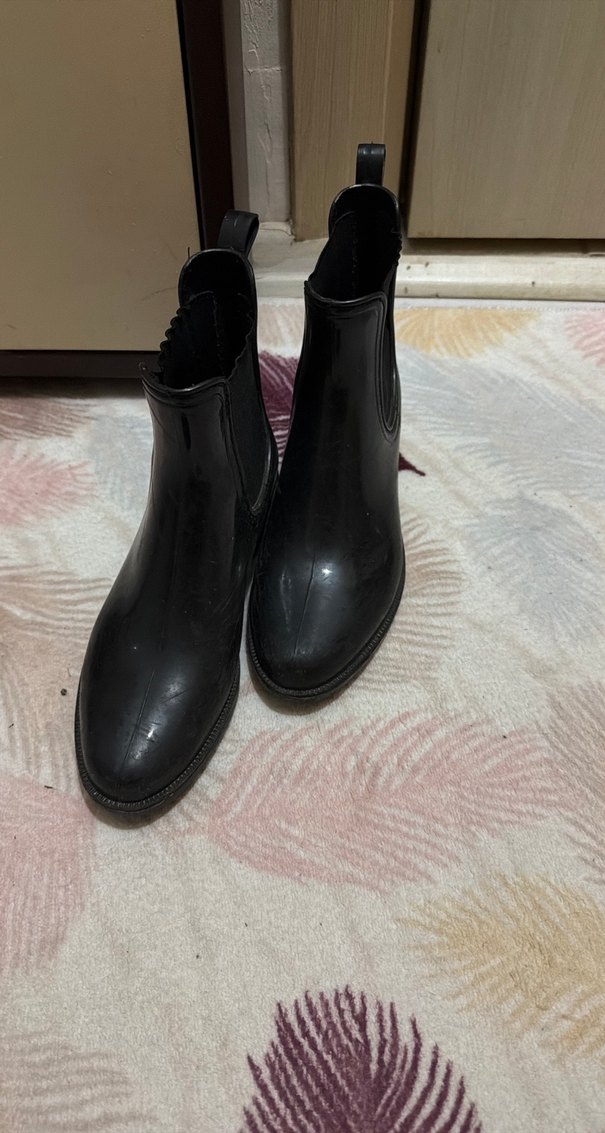 Siyah rugan malzemeden yapılmış, stiletto topuklu ve tokalı, desensiz kadın botu. Trendy günlük kullanım için uygundur.
