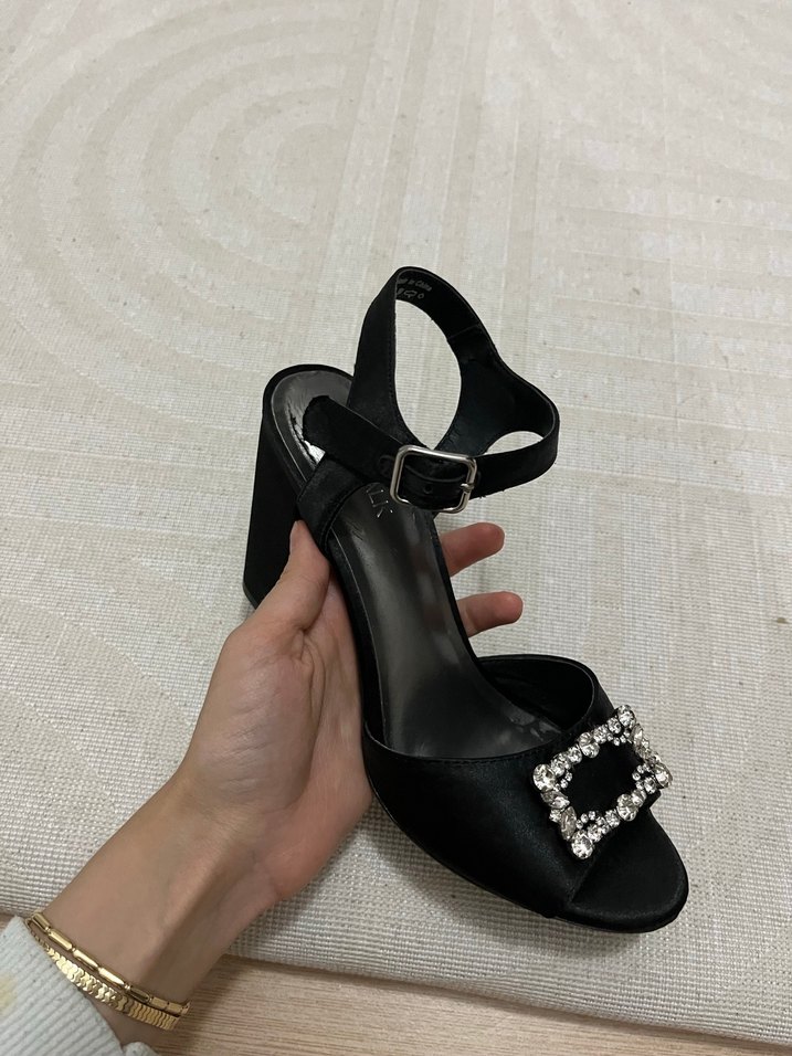Siyah parlak blok topuklu abiye ayakkabı, tokalı bilek kayışı ve yılan derisi desenli detaylara sahiptir. Klasik ve göz alıcı gotik tarzda, düğünler için uygundur.