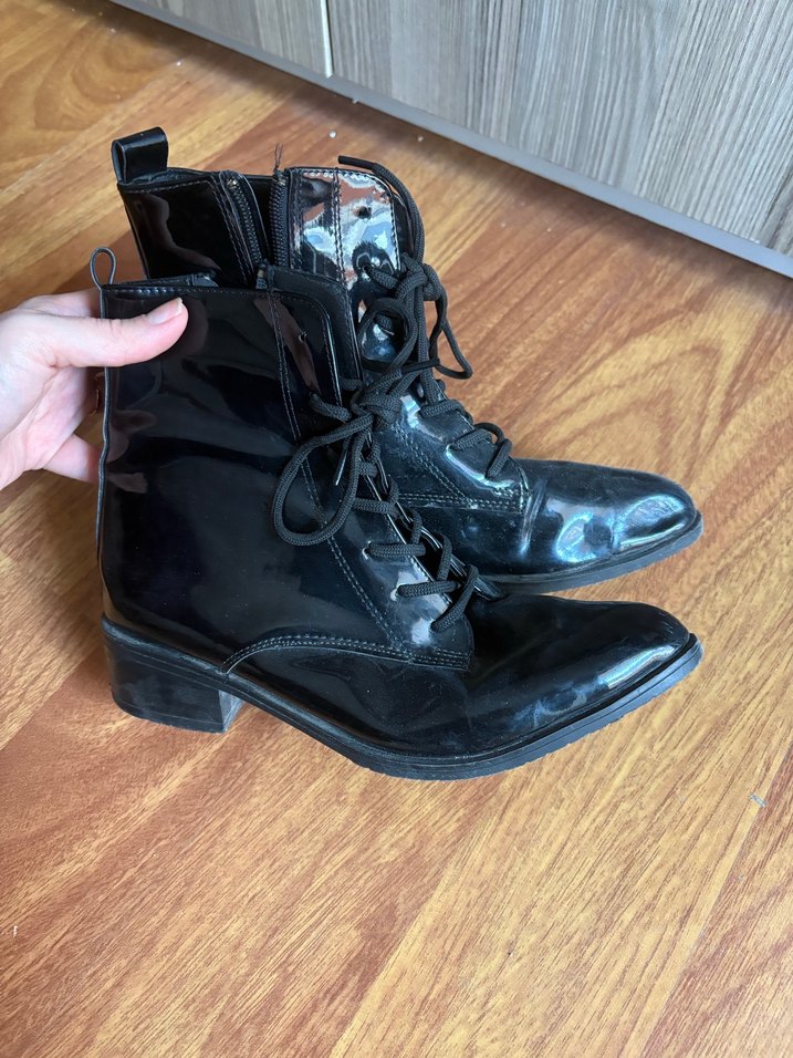 Siyah deri, tokalı ve bağcıklı blok topuklu botlar; goth ve grunge punk tarzında, günlük kullanım için uygun. Fotoğraftaki gibidir marka temsili