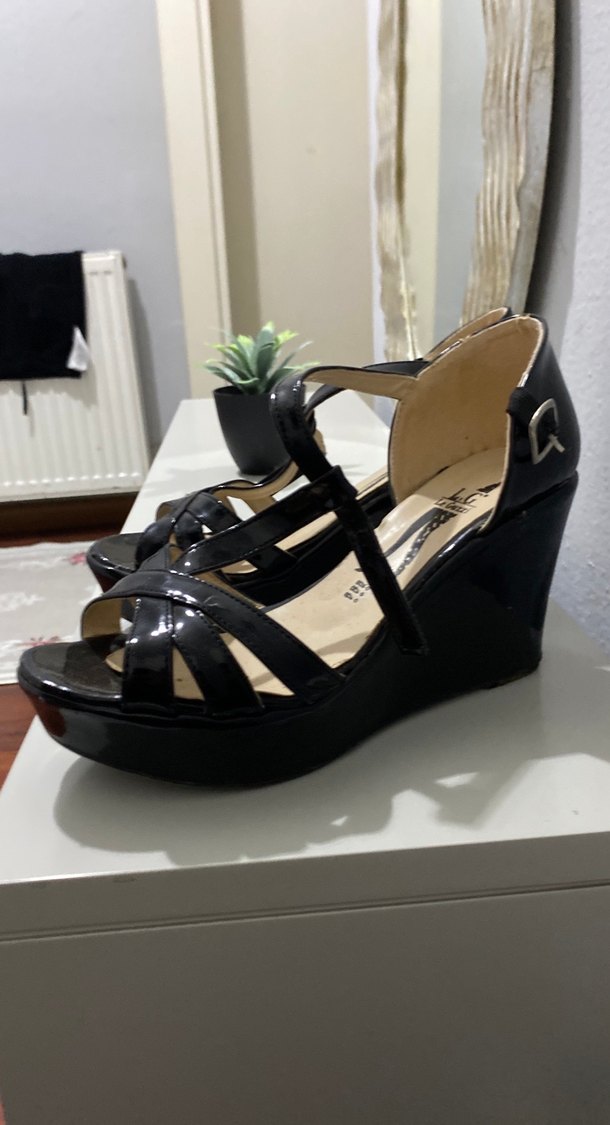 Siyah Rugan Tokalı Dolgu Topuk Kadın Ayakkabı