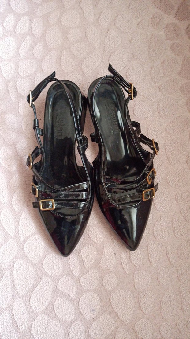 Siyah rugan malzemeden yapılmış, tokalı ve sivri burunlu gotik tarzda stiletto. Günlük kullanıma uygun.