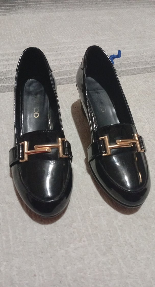 Kadınlar için blok topuklu, parlak siyah rugan malzemeden tokalı klasik ofis ayakkabısı.