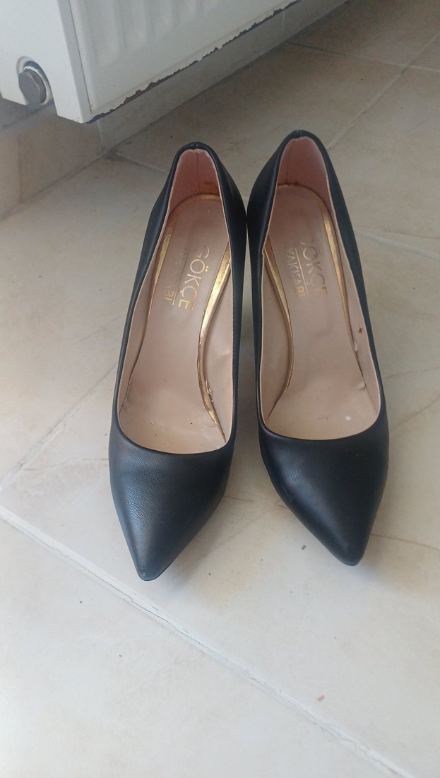 Siyah parlak kauçuk stiletto, tokalı detayı ve klasik sivri burun tasarımı ile ofis kullanımı için uygundur. İçinde "OKCE" markası bulunmaktadır.