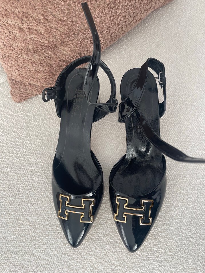 Siyah rugan malzemeden yapılmış, tokalı kayışlara ve baskılı tasarıma sahip sivri burunlu stiletto. Ofis için uygun çağdaş tarzda.