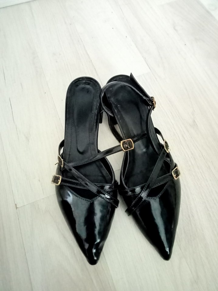 Siyah rugan tokalı stiletto kadın ayakkabısı, cesur ve minimalist gotik tarzı yansıtıyor. Günlük kullanım için uygundur. çok iyi durumda