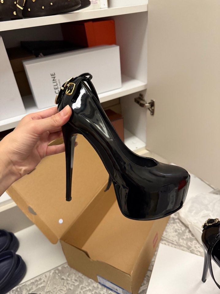 Parlak siyah rugan görünümlü, tokalı kayışlı stiletto topuklu ayakkabılar, cesur gotik Paris tarzını ofis kıyafetlerine yansıtıyor.