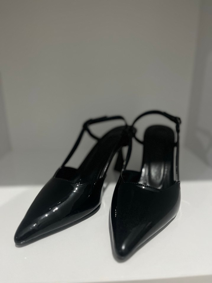 Siyah rugan, tokalı bantlı stiletto topuklu kadın ayakkabı. Minimalist gotik tarzı, ofis kullanımı için uygun.