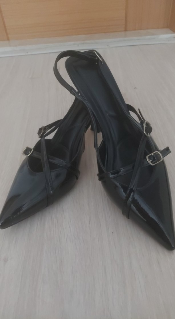 Tokalı askıları ve sivri burun tasarımıyla siyah rugan stiletto topuklu kadın ayakkabısı, gotik tarzda ve ofis kullanımı için uygundur.