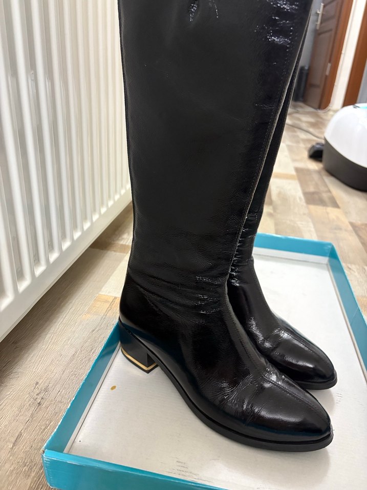 40 Numara sadece bi kez giydim temiz sorunsuz kalın çorap ile kullanıldı zaman 39 numaraya da uyum sağlıyor. Siyah parlak rugan malzemeden diz boyu kadın çizme, stiletto topuklu ve tokalı detaya sahip. Çağdaş ve şık Paris tarzını yansıtır.