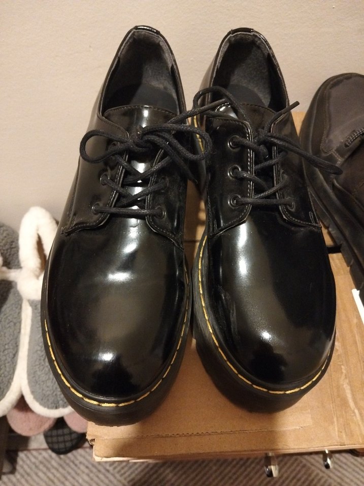 Siyah rugan topuklu, tokalı günlük kullanıma uygun goth ve punk tarzı ayakkabılar. Desensiz tasarım. 39 numaradır. Hiç kullanılmamıştır.