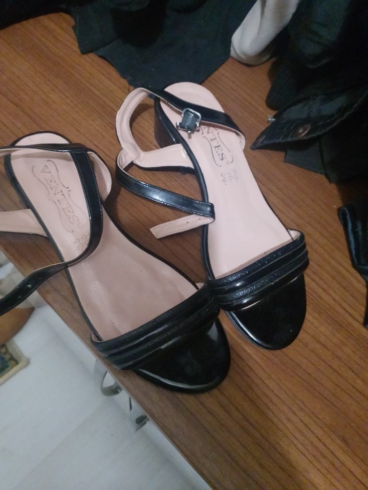 Siyah parlak rugan malzemeden, kayışlı topuklu klasik ve geleneksel tarzda kadın ayakkabısı. Günlük kullanıma uygun.