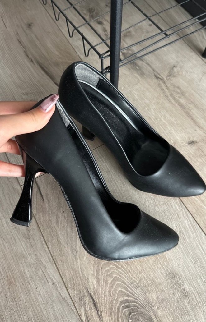 Ofis kullanımı için uygun, tokalı detaylı siyah rugan stiletto, sivri burunlu ve şık tasarımlı.