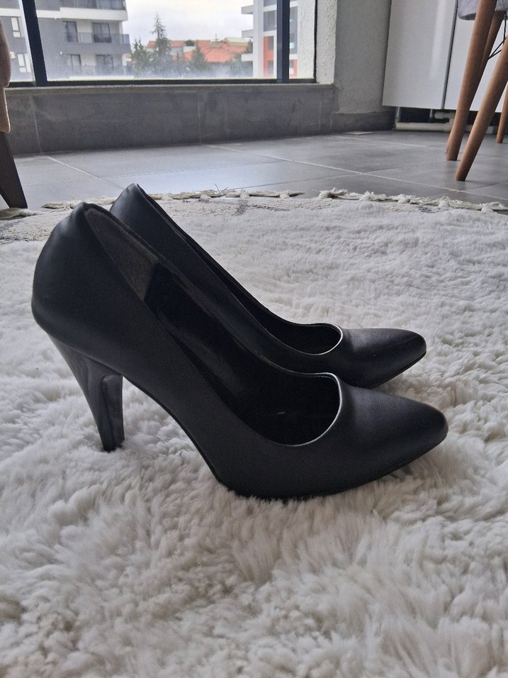 Siyah rugan görünümlü stiletto topuklu ayakkabı, klasik sivri burun ve kürk detaylı. Ofis için minimalist gotik stile uygun.
