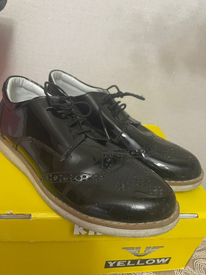 Parlak siyah rugan görünümlü klasik kadın ayakkabısı, stiletto topuklu ve günlük kullanıma uygun. Dantelli ve desensiz tasarıma sahip. Marka: YELLO.