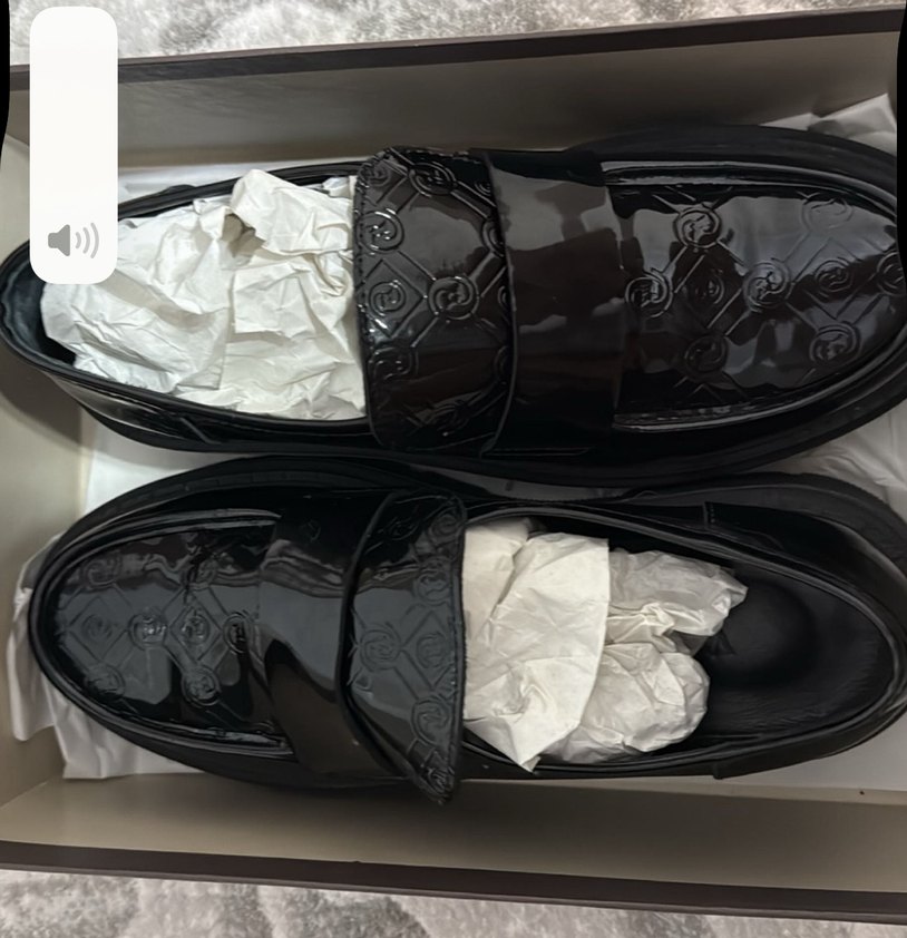 Siyah rugan malzemeden yapılmış, monogram desenli parlak kolej kadın ayakkabısı. Koyu ve şık tasarımıyla dikkat çekiyor.