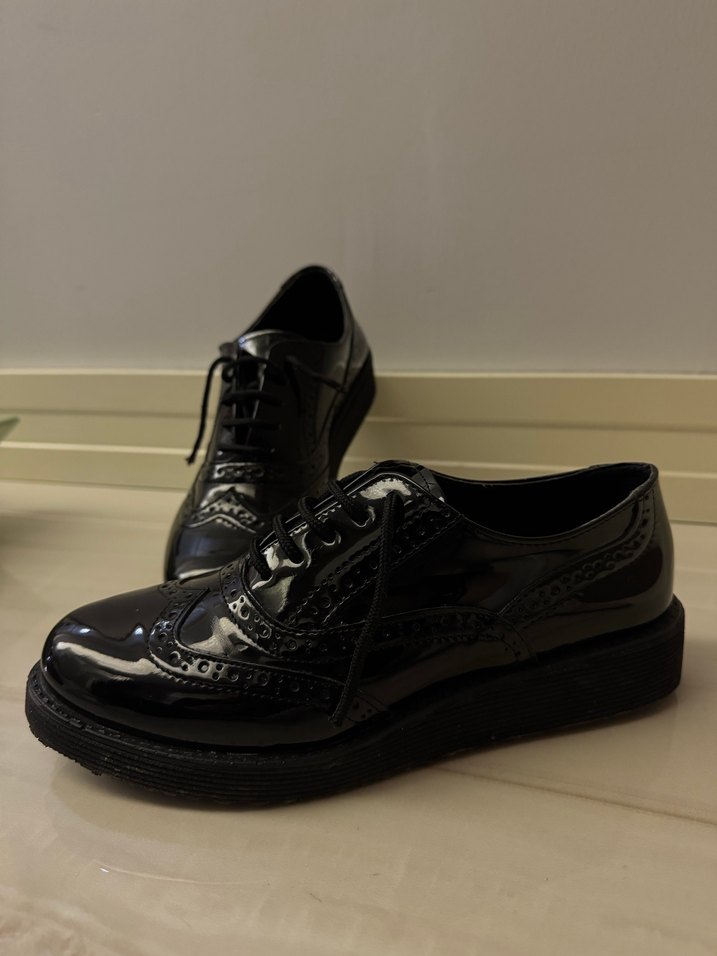 Siyah rugan, yılan desenli bağcıklı ayakkabılar, dolgu topuklu ve kauçuk malzemeden üretilmiştir, klasik gotik ofis tarzı için uygundur.