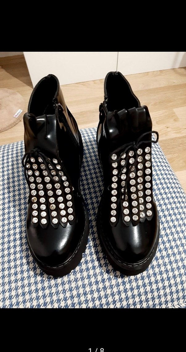 Bir kez giyildi,numara uymadığı için satışta, Parlak siyah kauçuk botlar, tokalı ve puantiyeli tasarımıyla gotik stili günlük kullanıma taşıyor. Kalın topuklu ve dikkat çekici.