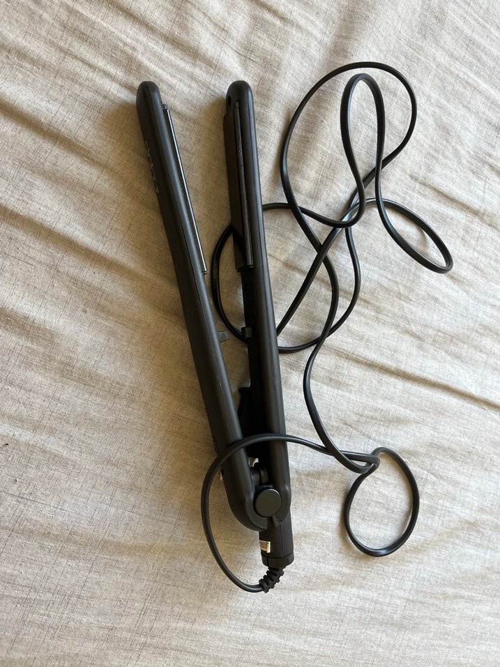 Uzun kabloya sahip siyah saç düzleştirici, saçları düzgün ve eşit ısı ile şekillendirir.