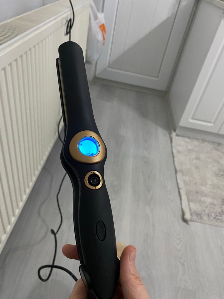 Dijital ekran ve ayarlanabilir ısı kontrolüne sahip siyah saç düzleştirici, ergonomik tasarımıyla rahat kullanım sağlar. En düşü 150 en yüksek 230 derece seramik taban bir iki kez kullanıldı