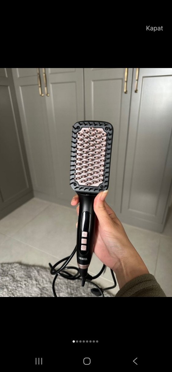 Siyah renkli, kontrol düğmeli saç düzleştirici fırça. Kablolu tasarımıyla kesintisiz güç sağlar. ✨