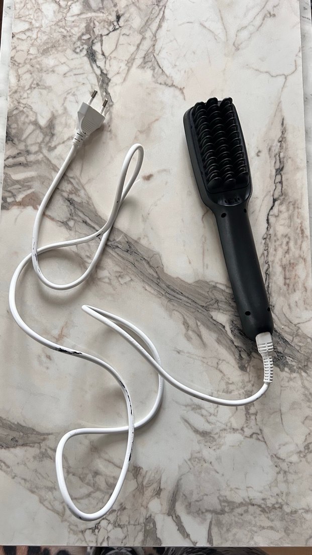 Gri ısıtma elemanlı, beyaz kablolu siyah saç düzleştirici fırça, kolay kullanım sağlar. ⚡