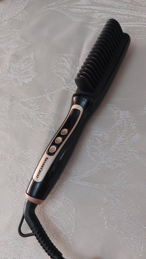 Siyah saç düzleştirici fırça, kullanımı kolay düğmeler ve tarak benzeri tasarımla saçları düzleştirir. Pratik ve kullanışlıdır. dijitalli ayarli