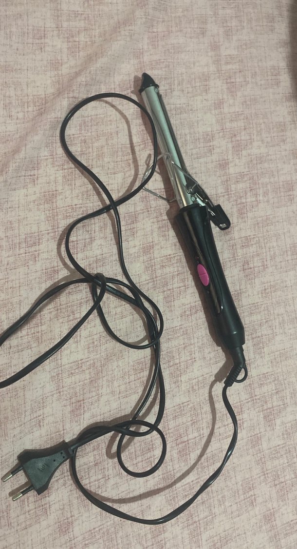 Renkli düğmeli siyah saç maşası, uzun kablosu ile rahat kullanım sağlar. Saçı sabitlemek için mandal mevcuttur.