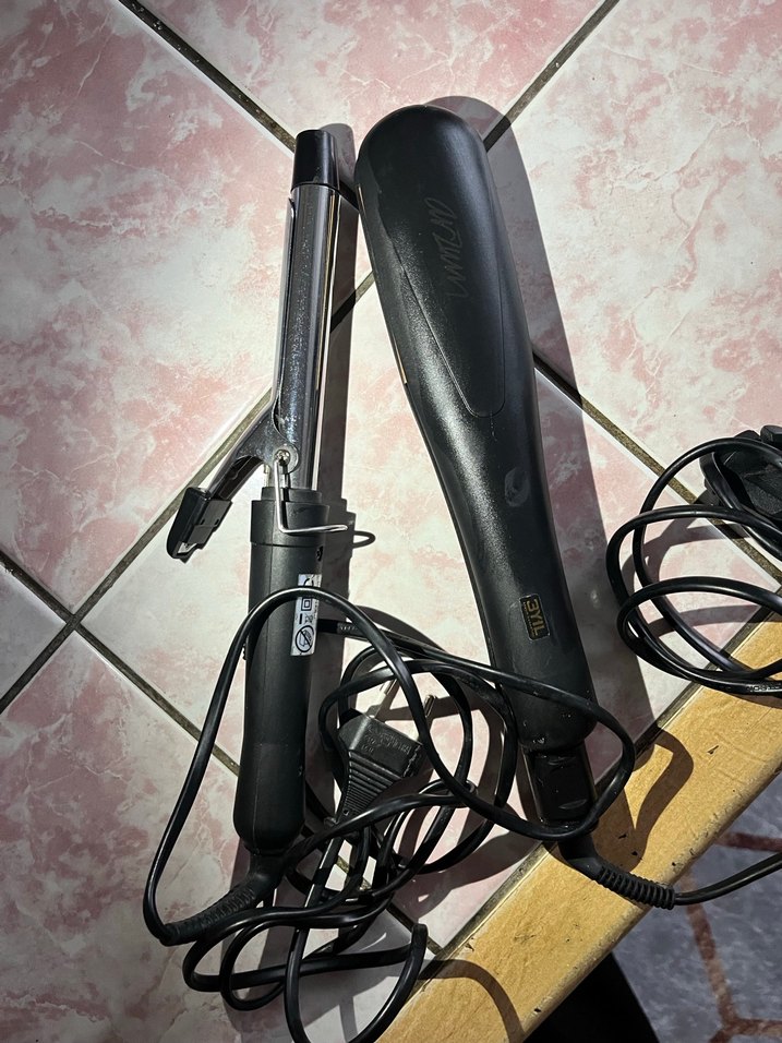 Saç şekillendirmek için siyah renkli saç maşası ve düzleştirici seti, kablolu ve kullanıma hazır.