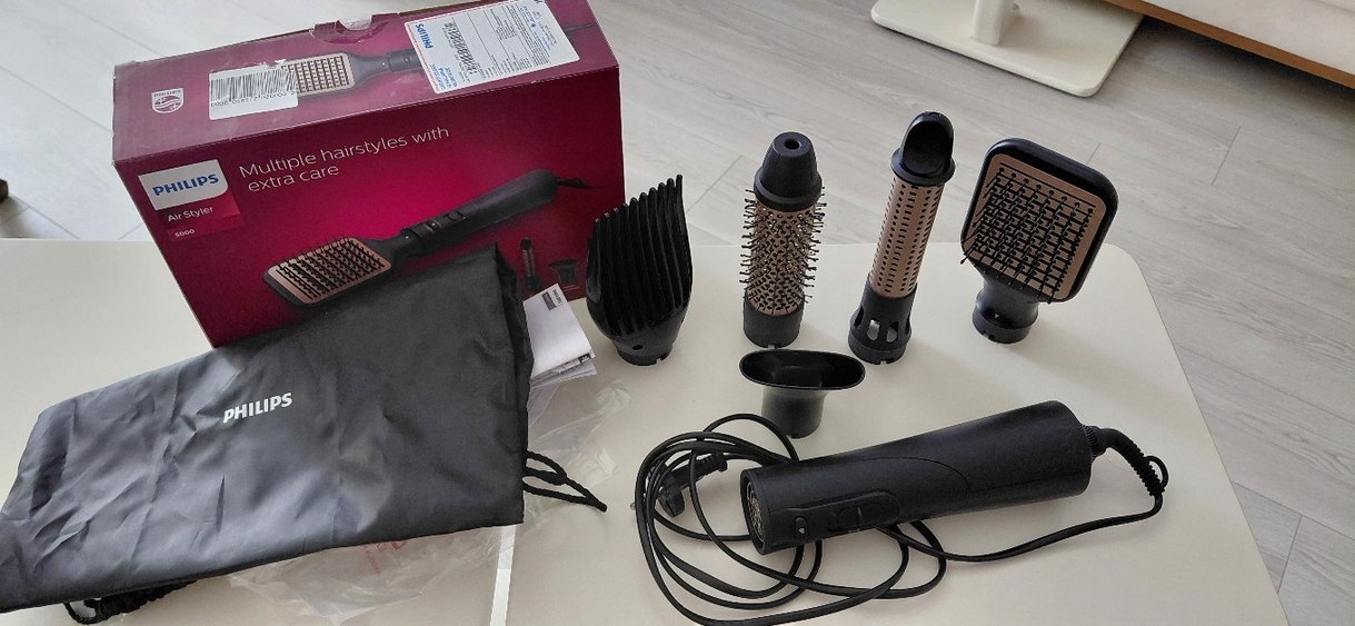 Bu siyah saç şekillendirici seti, yuvarlak fırça, odaklanmış hava başlığı, tarak aparatı ve kablolu saç kurutma makinesi tutacağı ile birlikte saklama çantası içerir. Çok yönlü saç şekillendirme için uygundur. Sorunsuz yeni gibi.