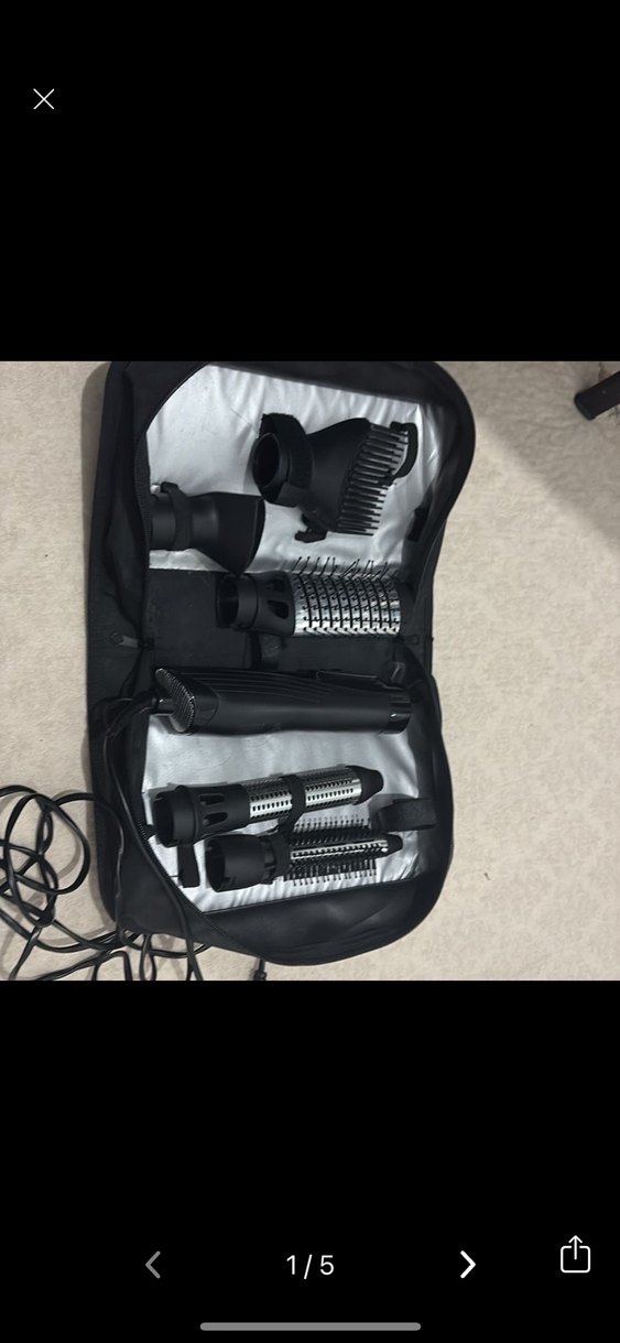 Çoklu başlıklarıyla siyah saç şekillendirici seti. Kolay saklama için kompakt taşıma çantasıyla birlikte temiz kullanıldı. ✨
