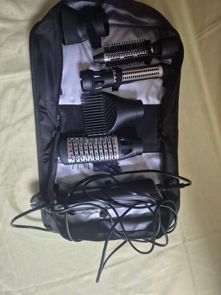 Çeşitli çıkarılabilir yuvarlak fırçalar ve tarak içeren siyah saç şekillendirici seti. Taşıma çantası ve güç kablosu ile birlikte gelir. ✂️