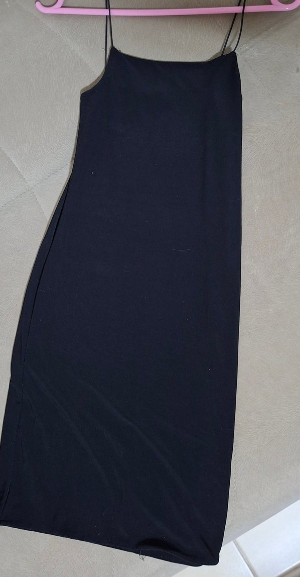 Lacivert uzun elbise, v yaka ve yan yırtmaçlıdır. Kolsuz ve sentetik dokulu kumaştan yapılmıştır, günlük sokak stili için uygundur.