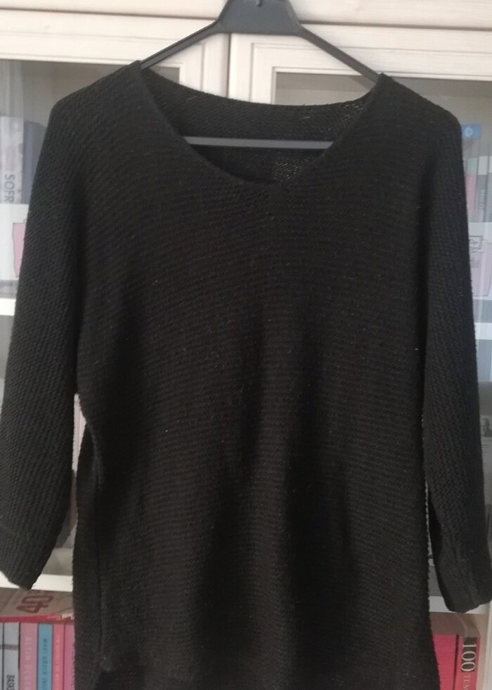 Delikli bir kazak yine iç gösterebilir ama çok belli değil fotoğrafta göstermeye çalıştım. Yarım kol Çok sade. Bol kesim dökümlu duruyor yine (benim bedenim s-m) Boy 70 kol 50 gögus 100 Marka temsili
