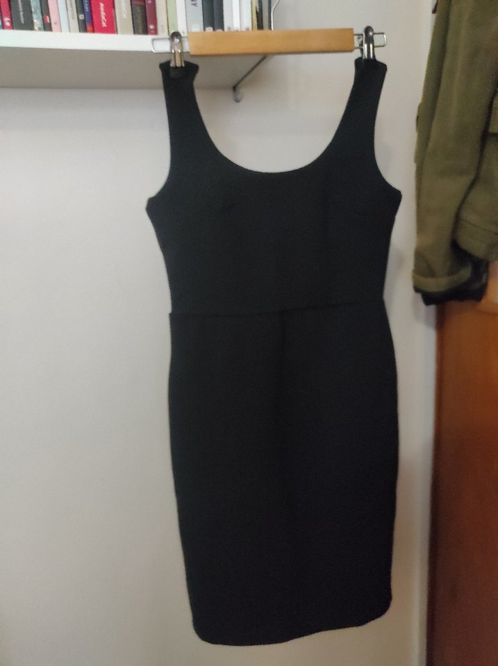 Kolsuz, siyah midi elbise, vücuda oturan kesim ve yuvarlak yaka ile minimalist ve şık gotik tarz sunar. Karol marka klasik elbise. belden oturuyor aşağısı düz kalem etek modelinde. etiketi yok ancak hiç giyilmedi küçük geldiği için satışta