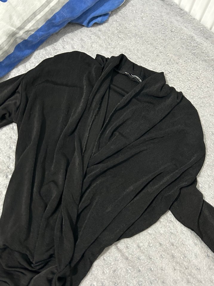 Kadın siyah keten hırka, uzun kollu ve salaş kesimdir. V yaka ve dökümlü tasarımıyla rahat ve şık bir görünüm sunar. Trendyolmilladır. Çıtçıtlıdır
