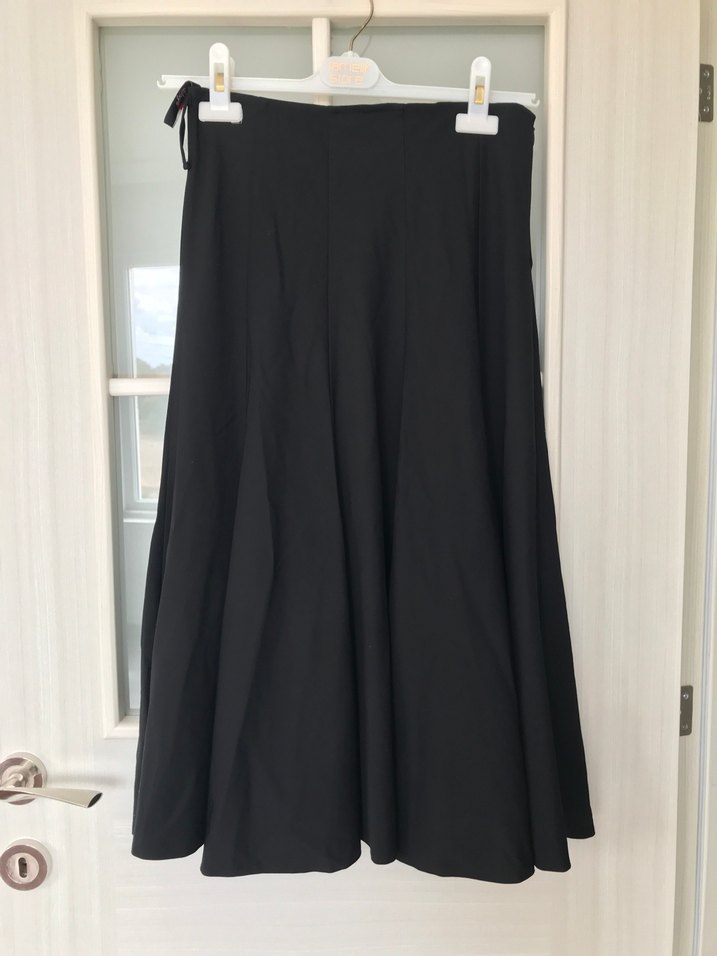 Siyah midi uzun etek, dökümlü ve salaş kesimlidir. Parçalı kloş etek çok şık duruyor boy 76 cm bel 36 cm dir