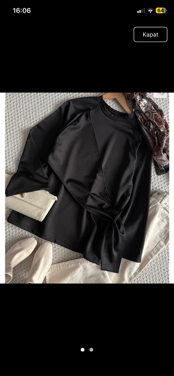 Siyah renkte, uzun kollu ve yuvarlak yakalı bu bluz, salaş kesimi ve drapeli detaylarıyla mini boyda, ipeksi dokuludur. Günlük kullanıma uygundur.